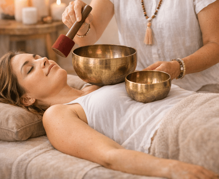 Een helend klankbad met twee Tibetaanse klankschalen.
